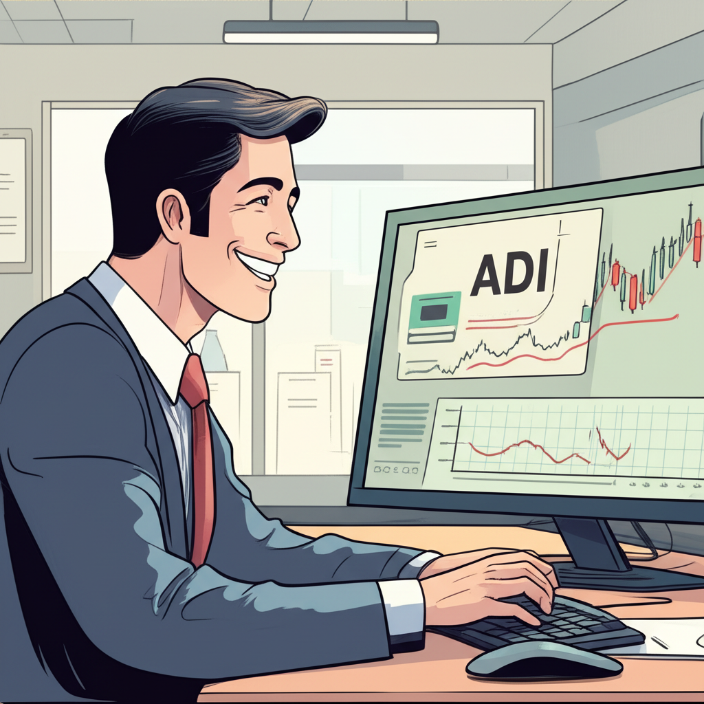 ภาพประกอบนักลงทุนชาวไทยยิ้มแย้มมองกราฟหุ้น ADI บนหน้าจอในออฟฟิศทันสมัย