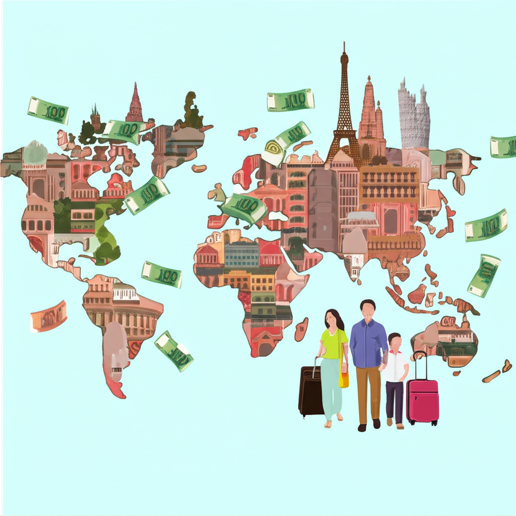 Illustration of euro banknotes with European landmarks and Thai travelers