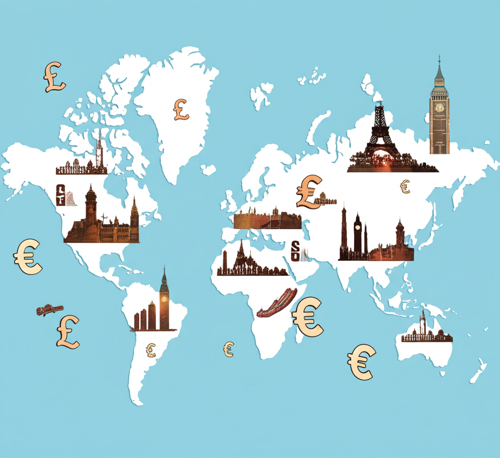 ภาพประกอบสัญลักษณ์เงินปอนด์และยูโรลอยเหนือแผนที่โลกพร้อมสถานที่สำคัญในยุโรป