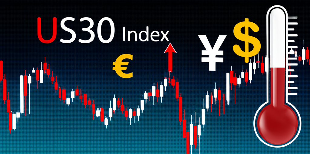 ภาพประกอบดัชนี US30 ที่มีสัญลักษณ์เศรษฐกิจโลกและเทอร์โมมิเตอร์แสดงสุขภาพตลาด