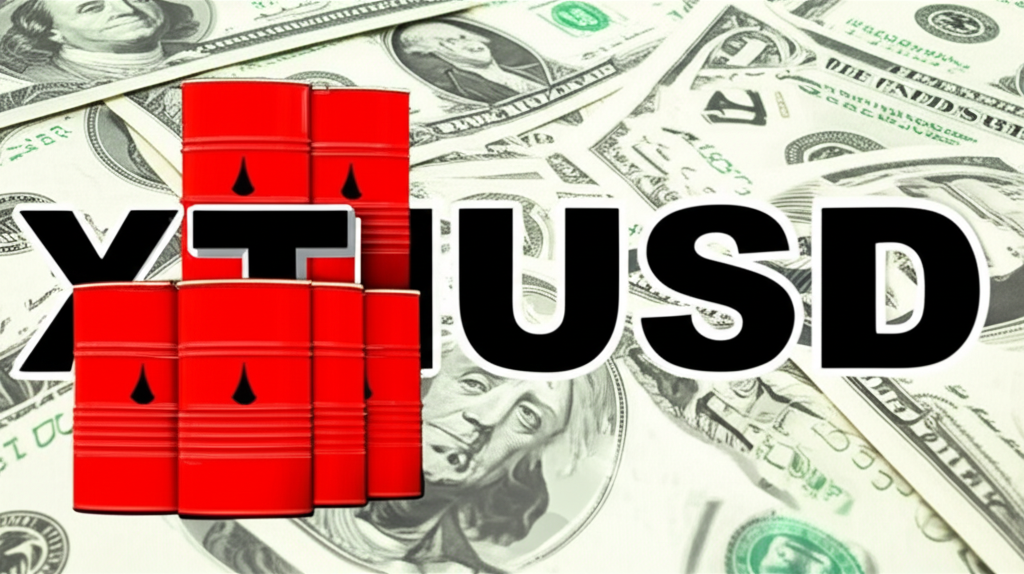 สัญลักษณ์ XTIUSD พร้อมถังน้ำมันดิบและสกุลเงินดอลลาร์สหรัฐในตลาดโลก